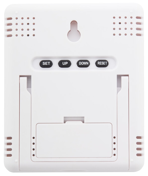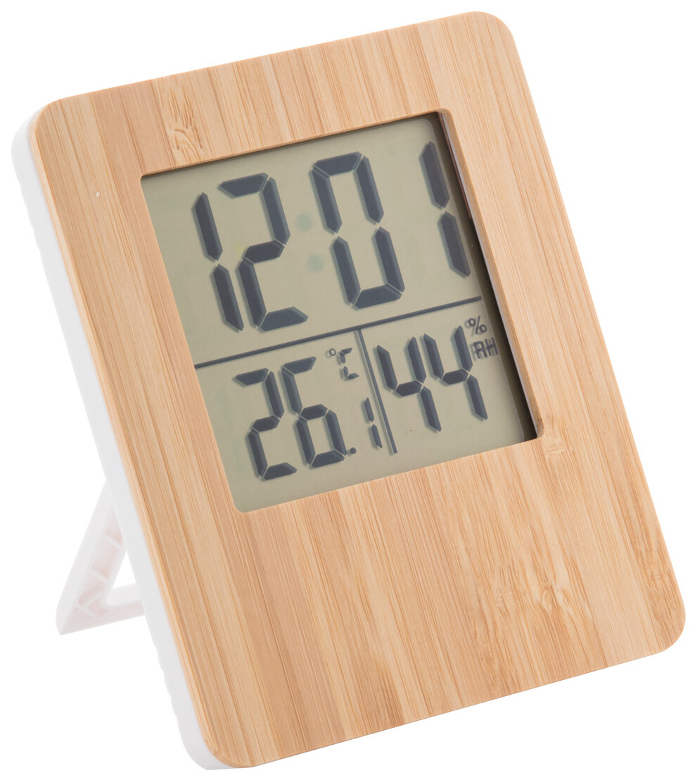 Meteostanice a digitální hodiny s bambusovým předním panelem. Funkce: budík, kalendář, teploměr a ukazatel vlhkosti. Funguje na 2 baterie AAA, bez baterie.