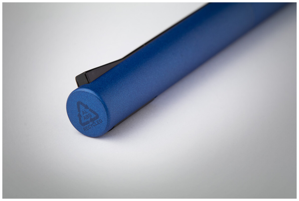 Kuličkové pero z recyklovaného hliníku v matné metalické barvě s horní částí z recyklovaného ABS a speciálním klipem. S modrou náplní.