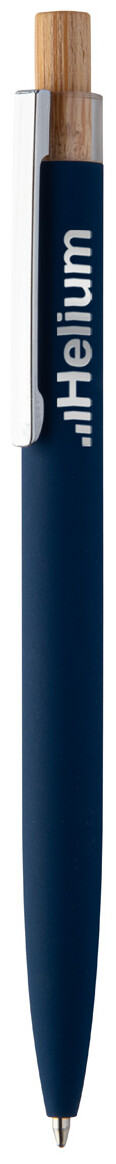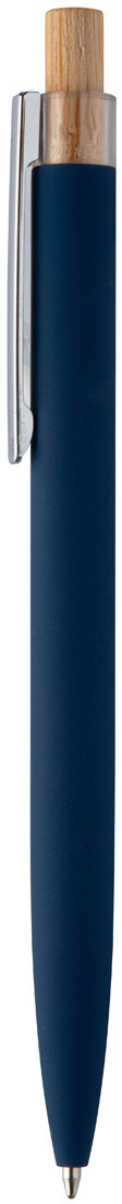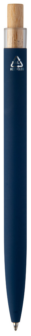 Kuličkové pero z recyklovaného hliníku s pogumovaným povrchem, bambusovým tlačítkem a chromovým klipem. Se speciální vrstvou pro zrcadlové laserové gravírování. S modrou náplní.