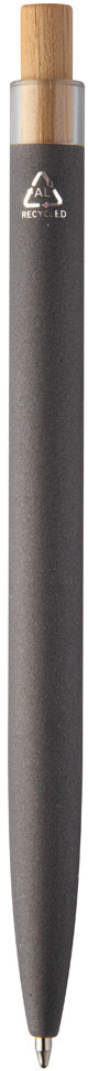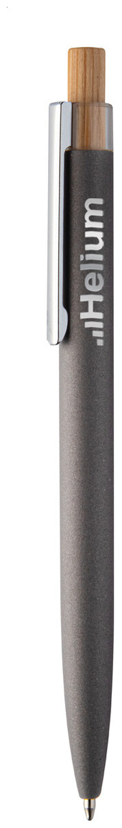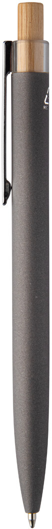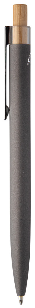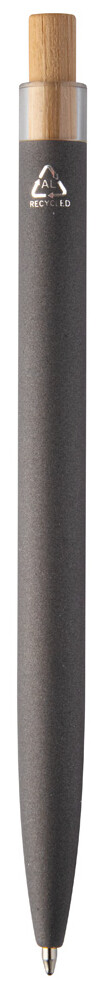 Kuličkové pero z recyklovaného hliníku s pogumovaným povrchem, bambusovým tlačítkem a chromovým klipem. Se speciální vrstvou pro zrcadlové laserové gravírování. S modrou náplní.
