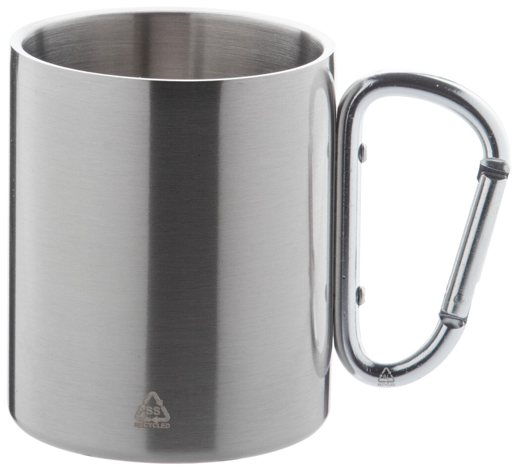 Dvoustěnný termo hrnek z recyklované nerezové oceli s karabinou z recyklovaného hliníku v odpovídající barvě. 300 ml. V kraftové papírové krabici.