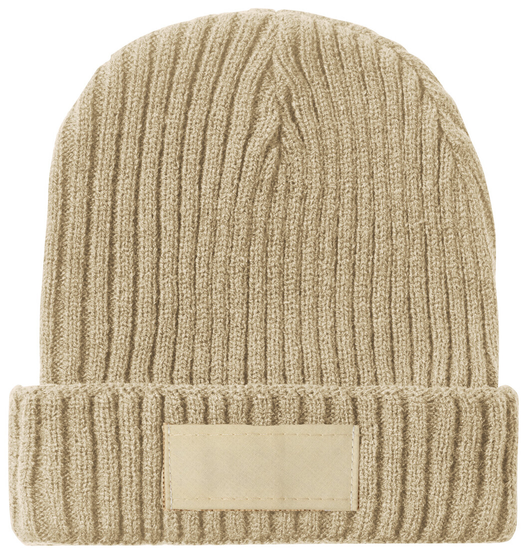 Akrylová pletená zimní čepice s nášivkou na potisk.