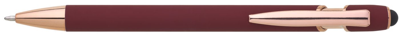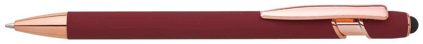 Kovová propiska se soft povrchem, touch koncovkou a doplňky v růžovo-zlaté barvě. Laserované logo je lesklé, růžovo-zlaté. Náplň modře píšící.