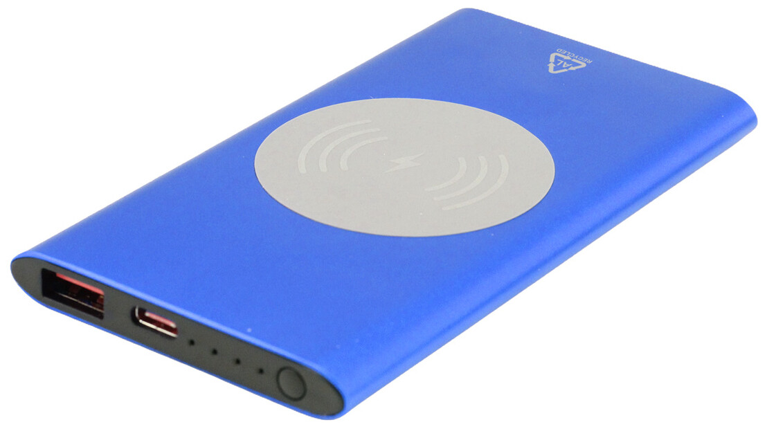 USB power banka z recyklovaného hliníku s vestavěnou bezdrátovou rychlonabíječkou (15W) a 4000 mAh baterií. S 1 portem USB a 1 portem USB-C pro nabíječku. Vstupní port USB-C. Včetně USB nabíjecího kabelu.