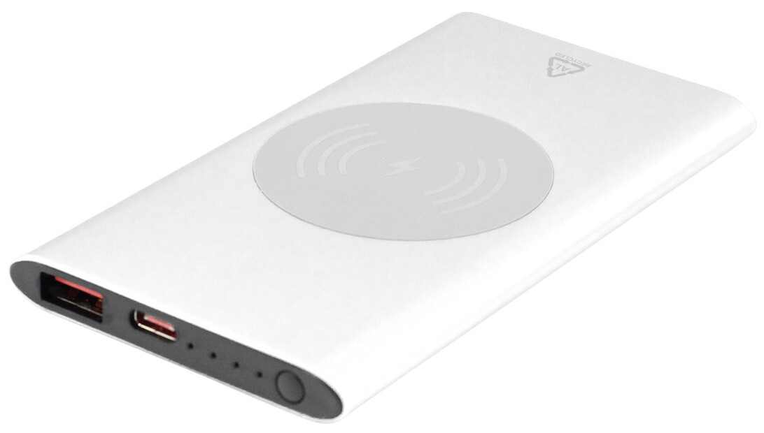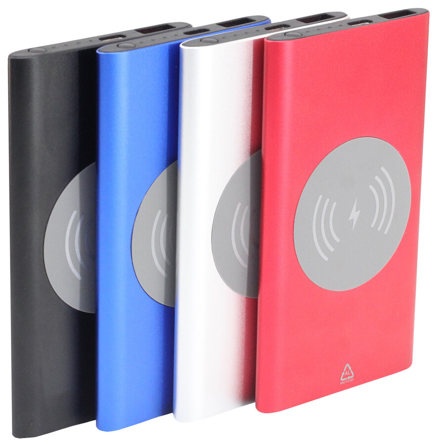 USB power banka z recyklovaného hliníku s vestavěnou bezdrátovou rychlonabíječkou (15W) a 4000 mAh baterií. S 1 portem USB a 1 portem USB-C pro nabíječku. Vstupní port USB-C. Včetně USB nabíjecího kabelu.