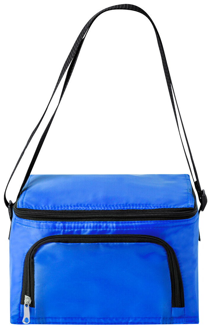 Polyesterová chladicí taška s přihrádkami na zip, hliníkovým polstrováním a ramenním popruhem. Pro 6 ks plechovek 0,33L. 210D polyester.