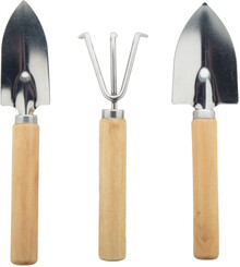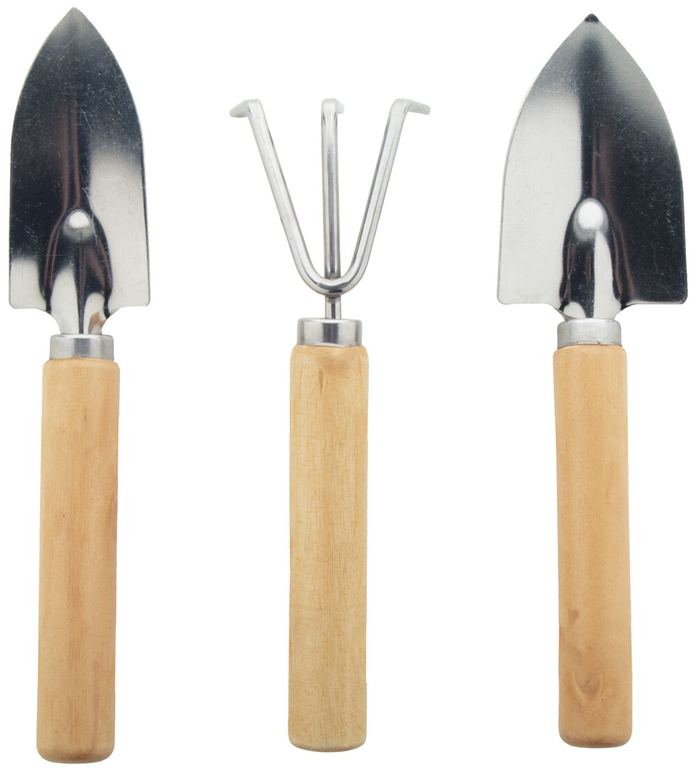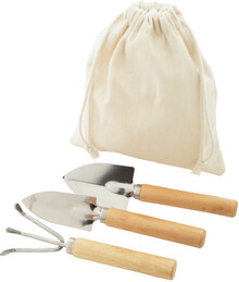 3dílná sada zahradního nářadí z nerezové oceli s dřevěnými rukojeťmi v bavlněném pytlíku se stahovací šňůrkou. Včetně hrabítek a 2 lopatek.