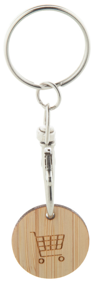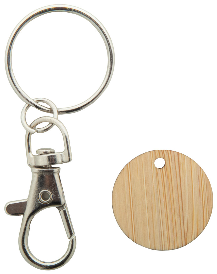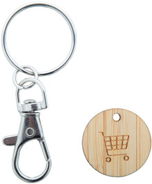 Kovový přívěsek na klíče s karabinou s bambusovým žetonem do nákupního vozíku. Velikost mince: ø23×2 mm.