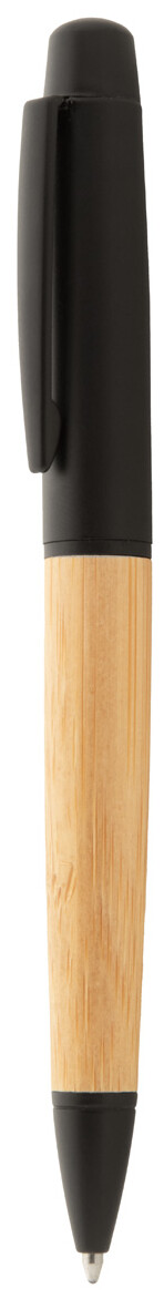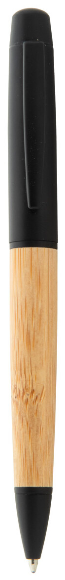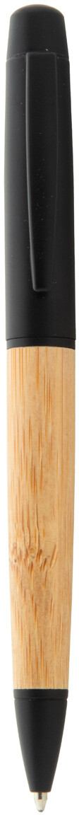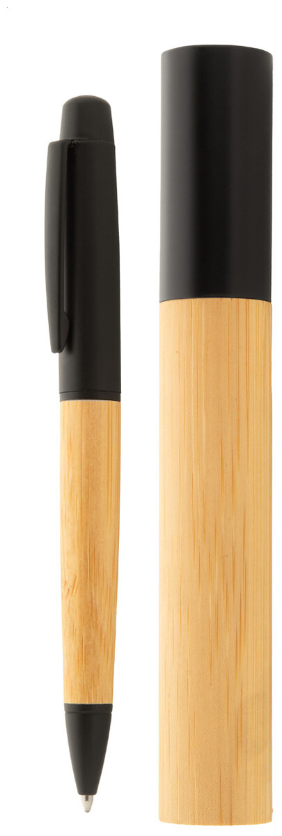 Elegantní černé kovové kuličkové pero s bambusovým tělem a černými částmi. V pouzdře z bambusové tuby s černým uzávěrem. S modrou náplní.