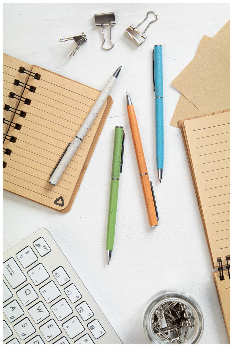 Ekologické plastové kuličkové pero z pšeničné slámy s chromovými detaily. S modrou náplní.