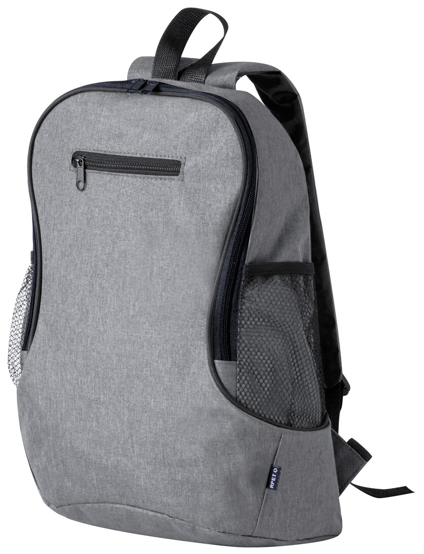 Batoh RPET s přihrádkou na zip a přední kapsou, boční síťované kapsy, polstrovaná záda a ramenní popruhy. 300D RPET polyester s výrazným štítkem RPET.