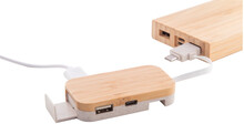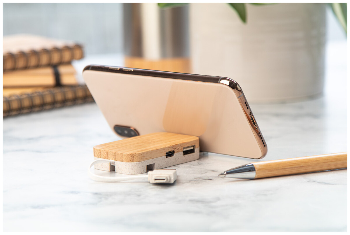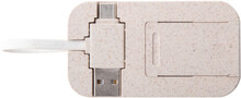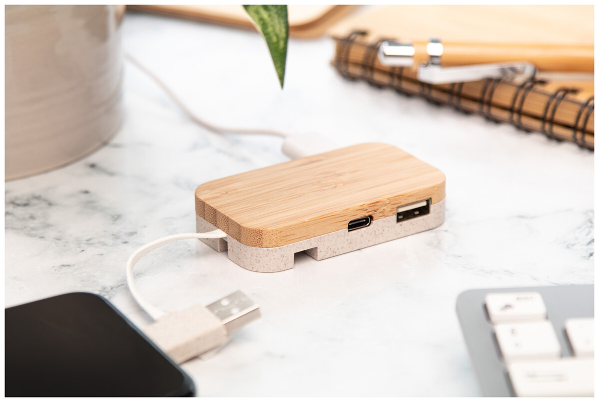 Plastový USB hub z bambusu a ekologické pšeničné slámy s funkcí stojánku na mobil. Se 2 USB a 2 USB-C porty, USB 2.0. Včetně kabelu s připojením USB a USB-C.
