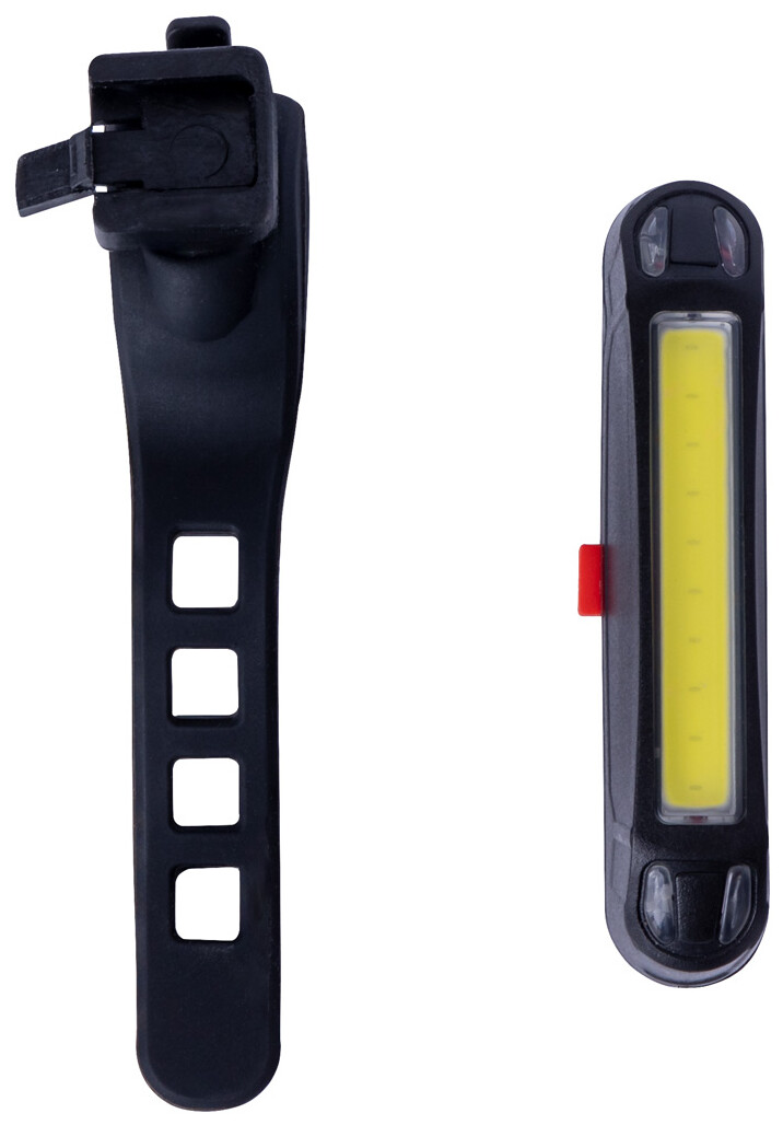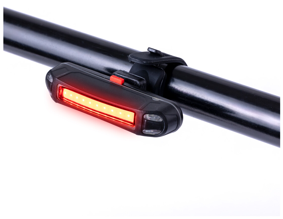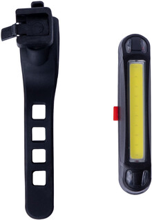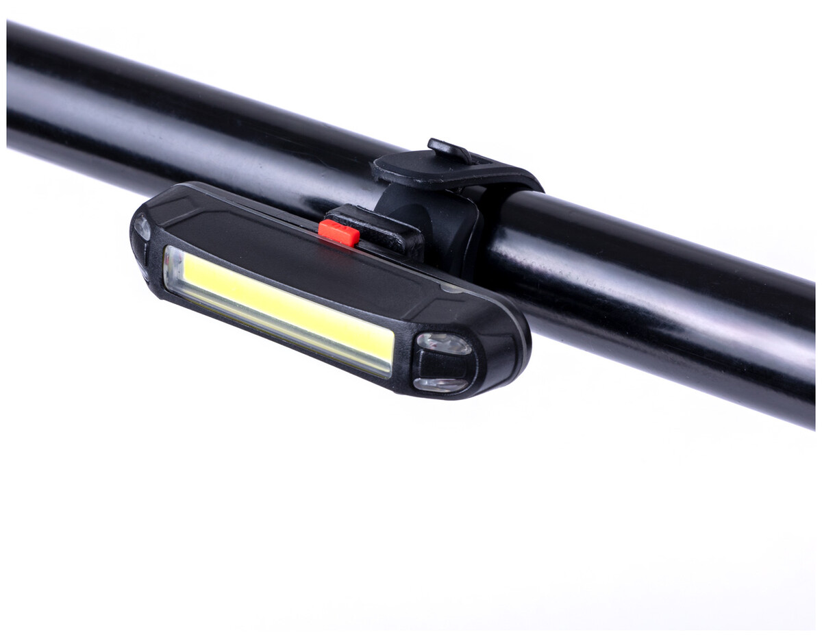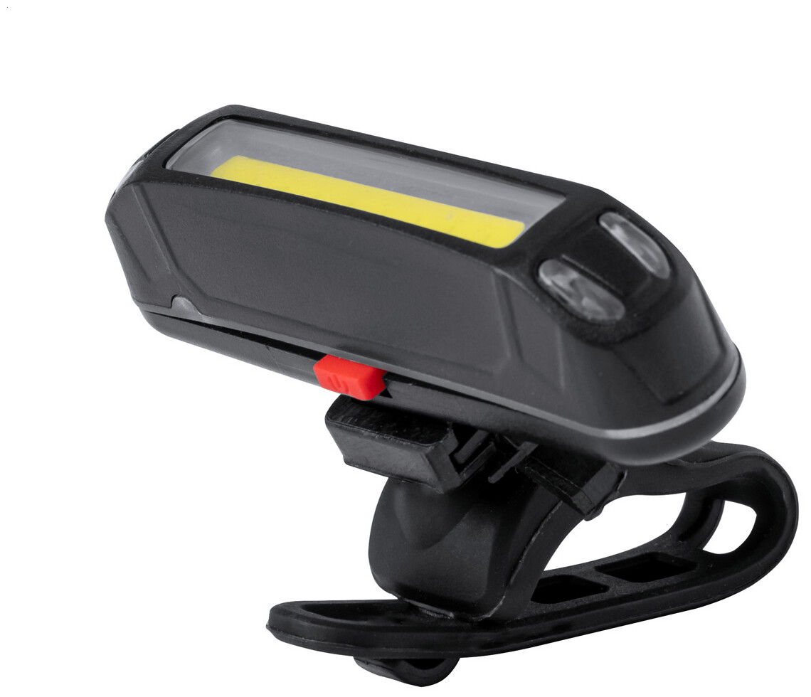 ABS plastové světlo na kolo s vysoce výkonným COB světlometem (bílé a červené světlo), vestavěnou USB dobíjecí baterií (350 mAh) a elastickým popruhem. S pevným a blikajícím režimem světla. Včetně USB nabíjecího kabelu. Neprodejné v následujících zemích: Německo, Rakousko, Švýcarsko.