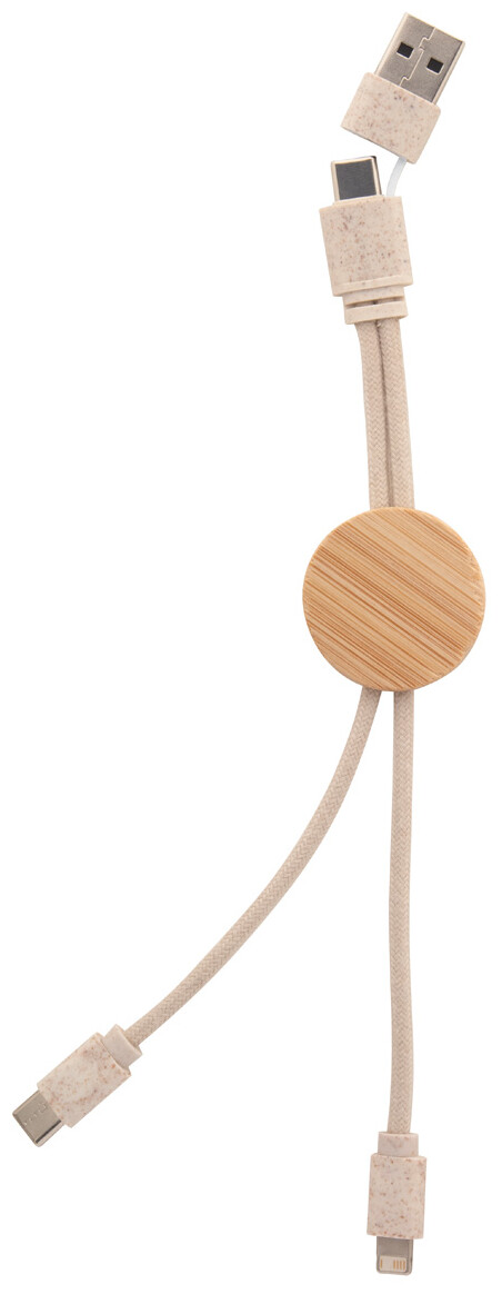 Ekologický USB nabíjecí kabel z pšeničné slámy, bavlny a bambusu s konektory micro USB, USB-C a Lightning. Se vstupy USB a USB-C.