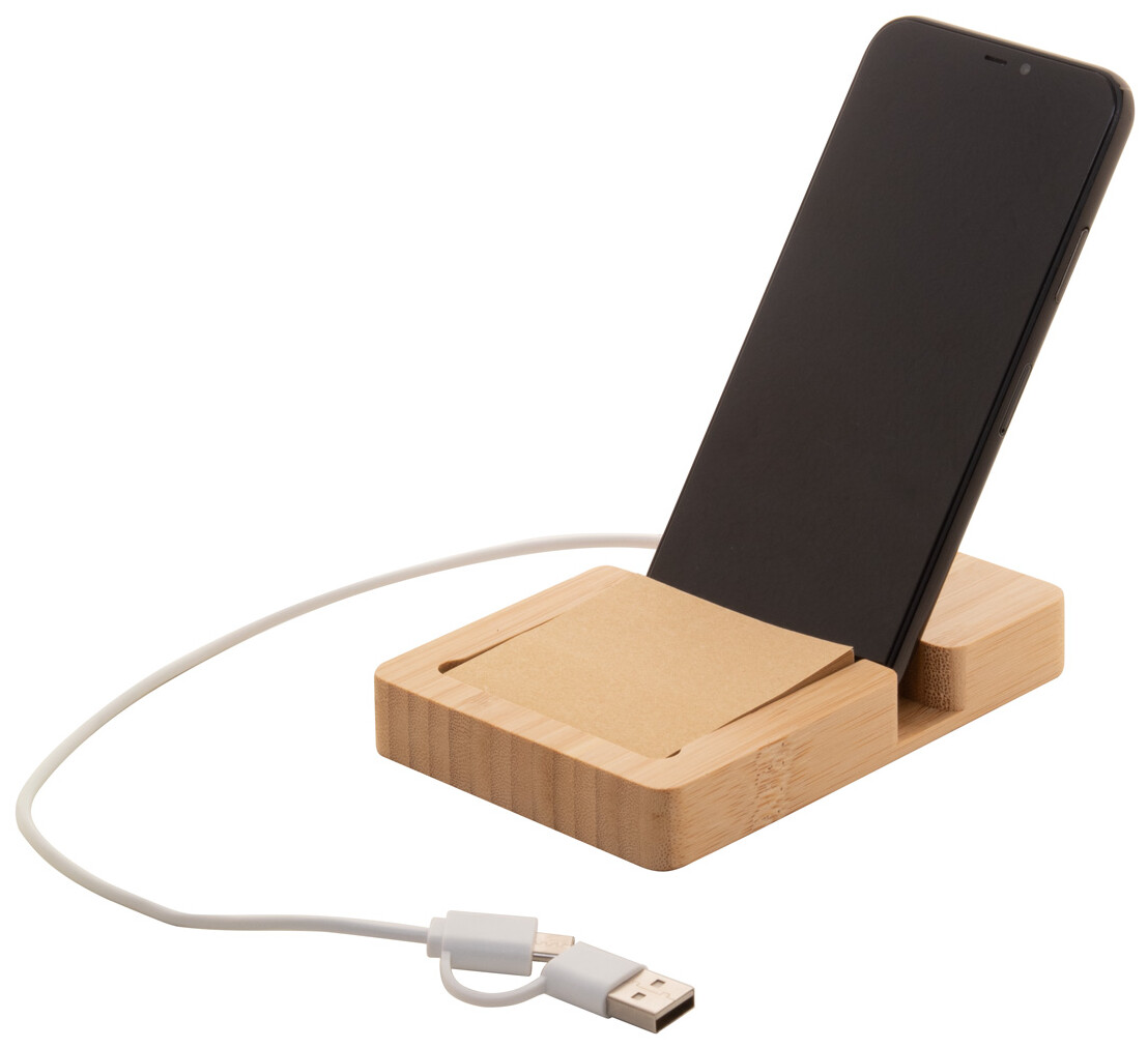 Bambusový USB hub s držákem na mobil a 130 listy kraftových papírových lepících papírků (60x60 mm). Se 2 USB a 2 USB-C porty, USB 2.0. Včetně kabelu s připojením USB a USB-C.