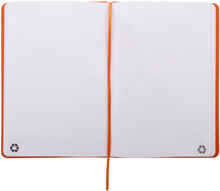 Blok A5 z recyklované PU kůže se 100 čistými listy z recyklovaného papíru. Se záložkou v odpovídající barvě a gumičkou.