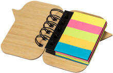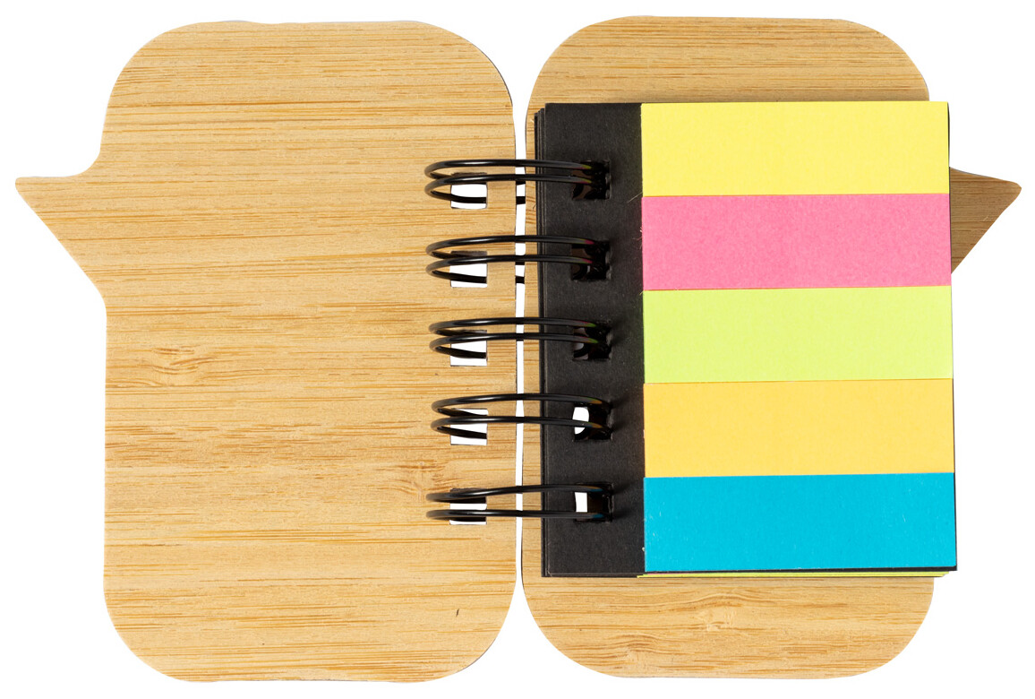 Poznámkový blok ve spirále potažený bambusem se 100 velkými lepicími papírky (ve 4 různých barvách) a 125 značkami stránek (v 5 různých barvách).