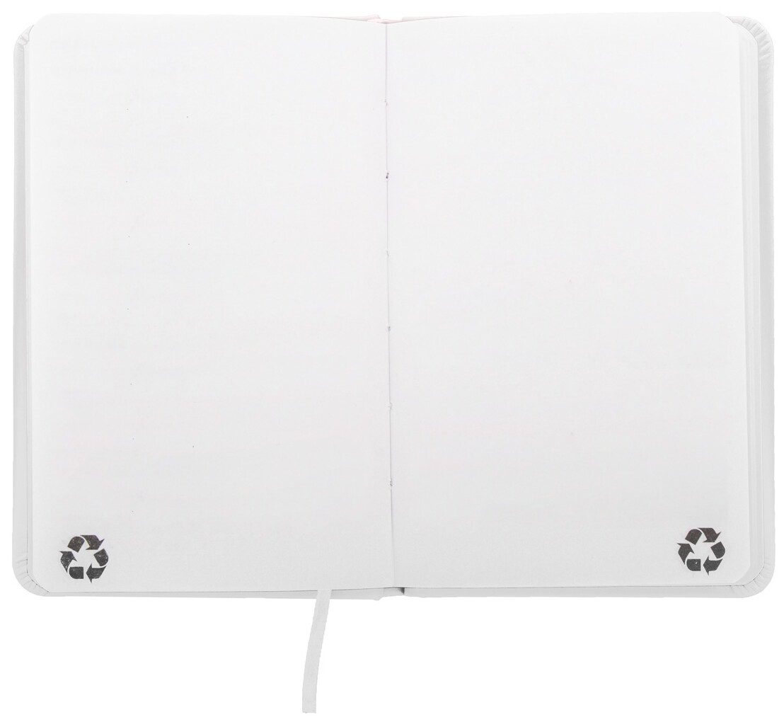 Blok A6 z recyklované PU kůže se 100 čistými listy z recyklovaného papíru. Se záložkou v odpovídající barvě a gumičkou.