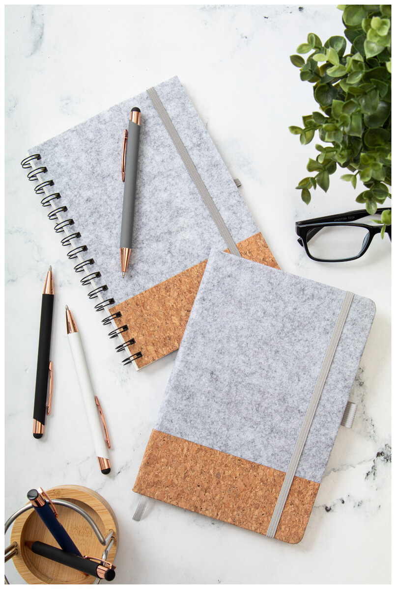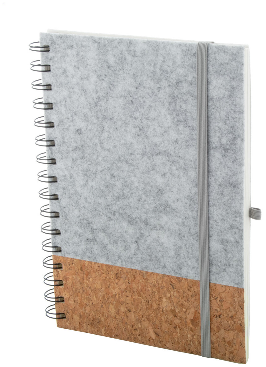 Spirálový blok A5 z RPET plsti a přírodního korku se 70 linkovanými listy z recyklovaného papíru. S gumovým páskem a držákem na pero.