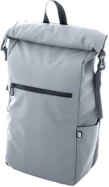 Vodotěsný rolovací batoh z RPET se zapínáním na přezku a suchý zip, polstrovaná přihrádka na notebook (16") a tablet (10"), přední kapsa na zip, boční kapsy, polstrovaná záda a ramenní popruhy. Polyester 600D RPET potažený PU, s výrazným štítkem RPET.
