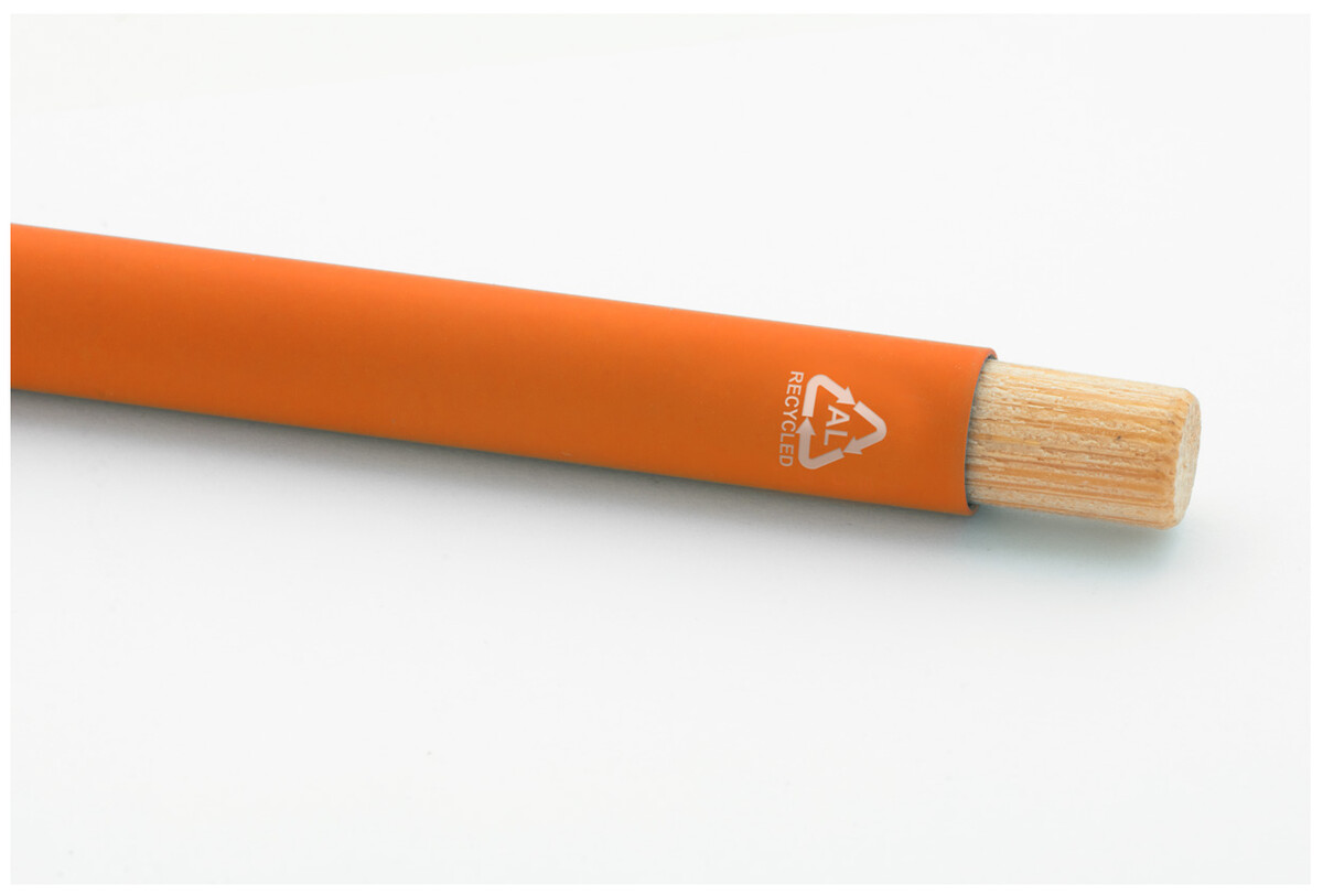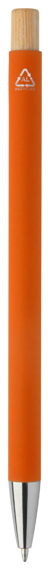 Kuličkové pero z recyklovaného hliníku s pogumovaným povrchem a bambusovým tlačítkem a chromovými detaily. Se speciální vrstvou pro zrcadlové laserové gravírování. S modrou náplní.
