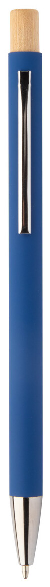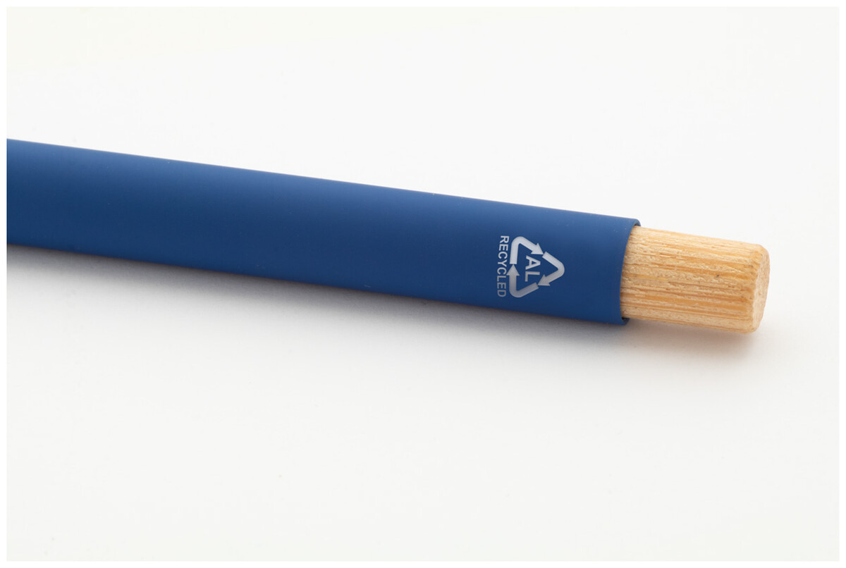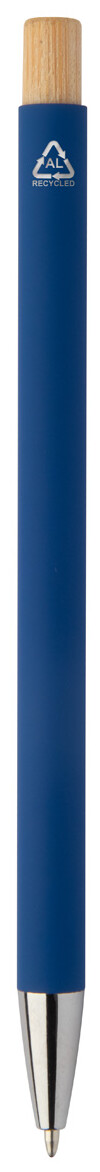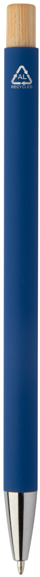 Kuličkové pero z recyklovaného hliníku s pogumovaným povrchem a bambusovým tlačítkem a chromovými detaily. Se speciální vrstvou pro zrcadlové laserové gravírování. S modrou náplní.