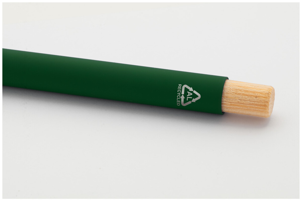 Kuličkové pero z recyklovaného hliníku s pogumovaným povrchem a bambusovým tlačítkem a chromovými detaily. Se speciální vrstvou pro zrcadlové laserové gravírování. S modrou náplní.
