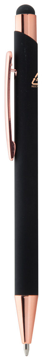 Kuličkové a dotykové pero z recyklovaného hliníku s pogumovaným povrchem a detaily v barvě růžového zlata. Se speciální povrchovou úpravou pro zrcadlové laserové gravírování v barvě růžového zlata. S modrou náplní.