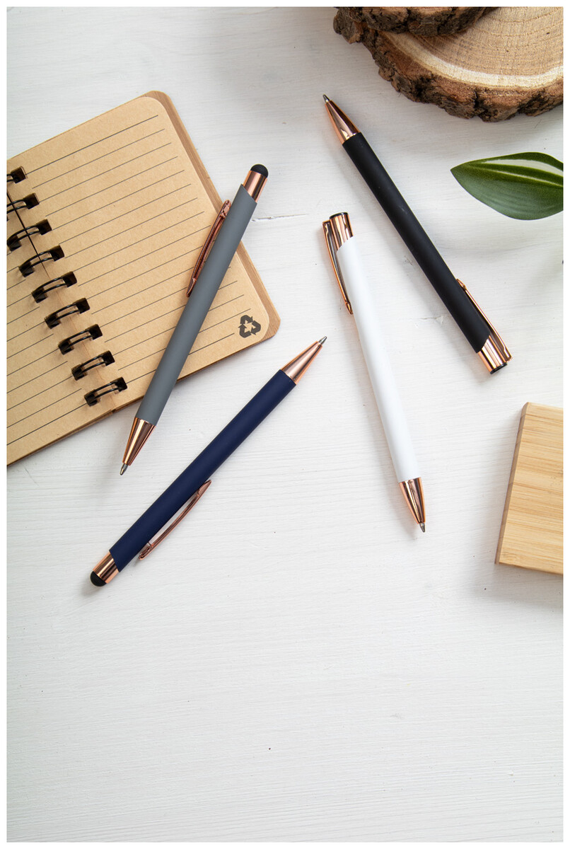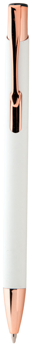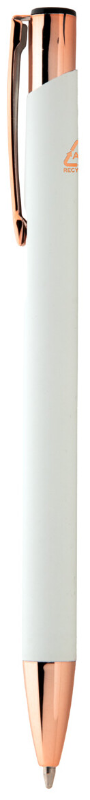 Kuličkové pero z recyklovaného hliníku s pogumovaným povrchem a detaily v barvě růžového zlata. Se speciální povrchovou úpravou pro zrcadlové laserové gravírování v barvě růžového zlata. S modrou náplní.