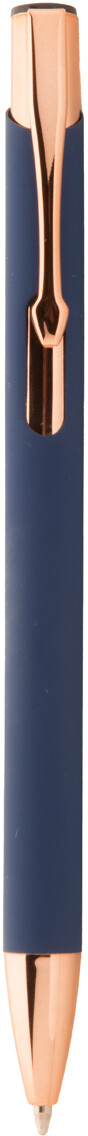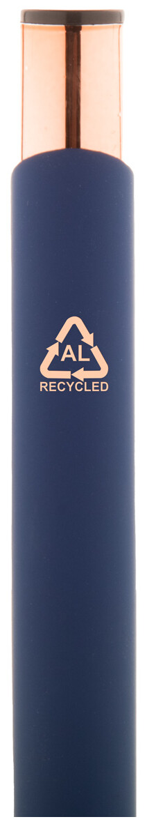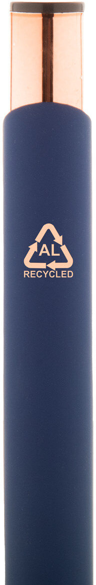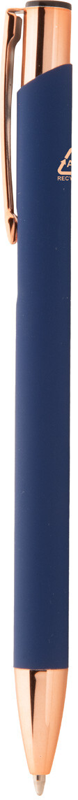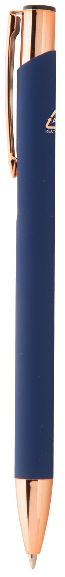 Kuličkové pero z recyklovaného hliníku s pogumovaným povrchem a detaily v barvě růžového zlata. Se speciální povrchovou úpravou pro zrcadlové laserové gravírování v barvě růžového zlata. S modrou náplní.
