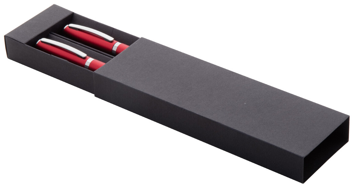 Sada per z recyklovaného hliníku s rollerem a kuličkovým perem v černé papírové dárkové krabičce. S modrou náplní.