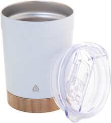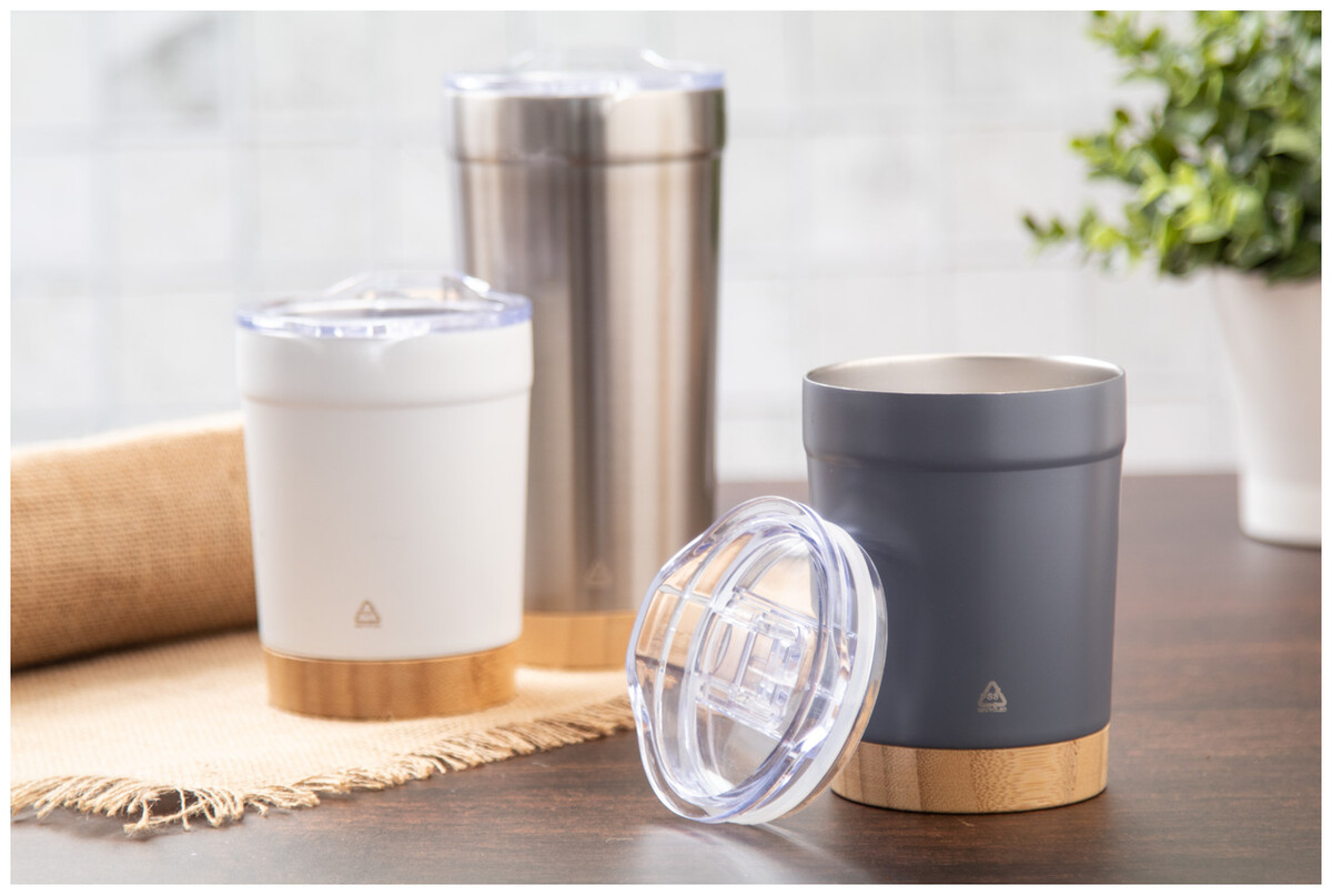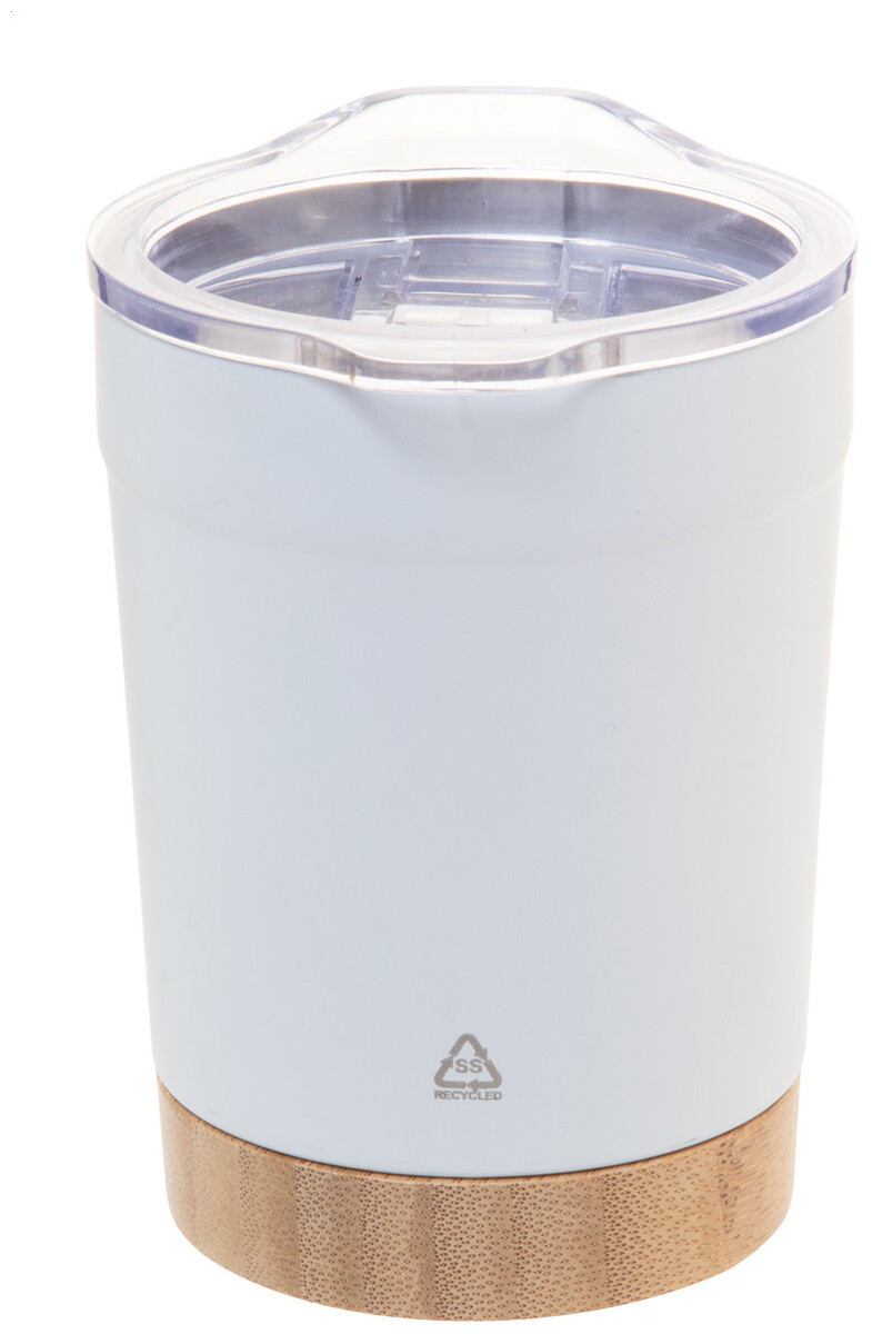 Dvoustěnný vakuově izolovaný termo hrnek z recyklované nerezové oceli s bambusovým dnem a AS plastovým víčkem na pití. 300 ml.