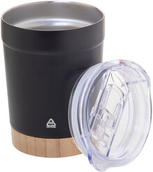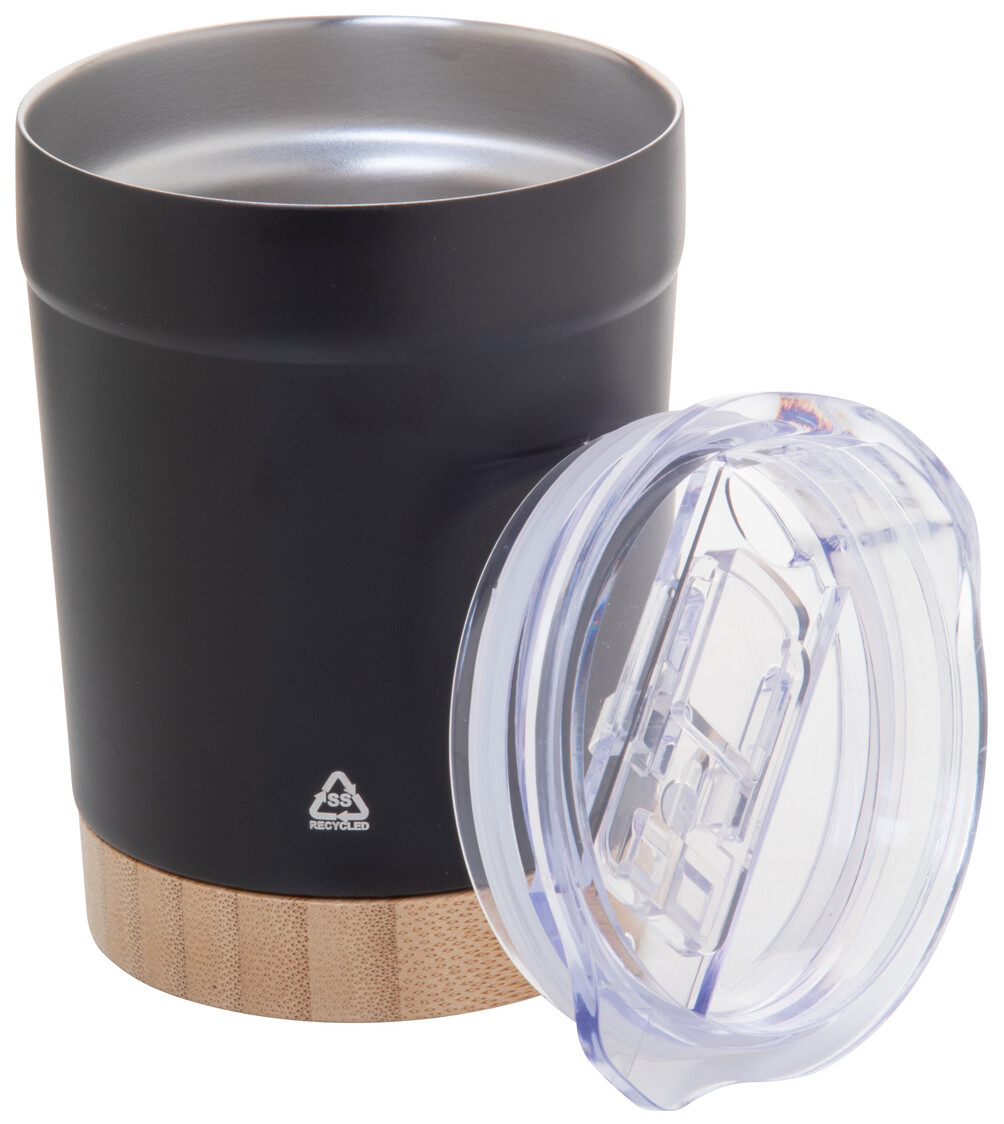 Dvoustěnný vakuově izolovaný termo hrnek z recyklované nerezové oceli s bambusovým dnem a AS plastovým víčkem na pití. 300 ml.