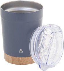 Dvoustěnný vakuově izolovaný termo hrnek z recyklované nerezové oceli s bambusovým dnem a AS plastovým víčkem na pití. 300 ml.