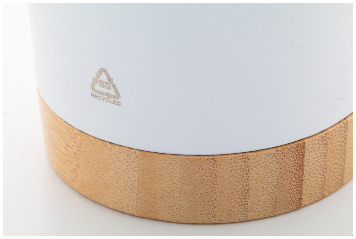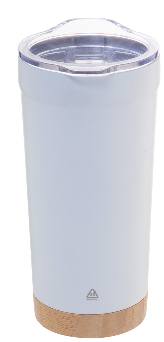 Dvoustěnný vakuově izolovaný termo hrnek z recyklované nerezové oceli s bambusovým dnem a AS plastovým víčkem na pití. 600 ml.
