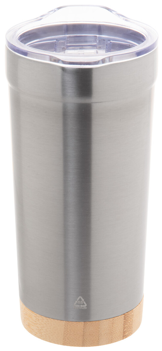Dvoustěnný vakuově izolovaný termo hrnek z recyklované nerezové oceli s bambusovým dnem a AS plastovým víčkem na pití. 600 ml.