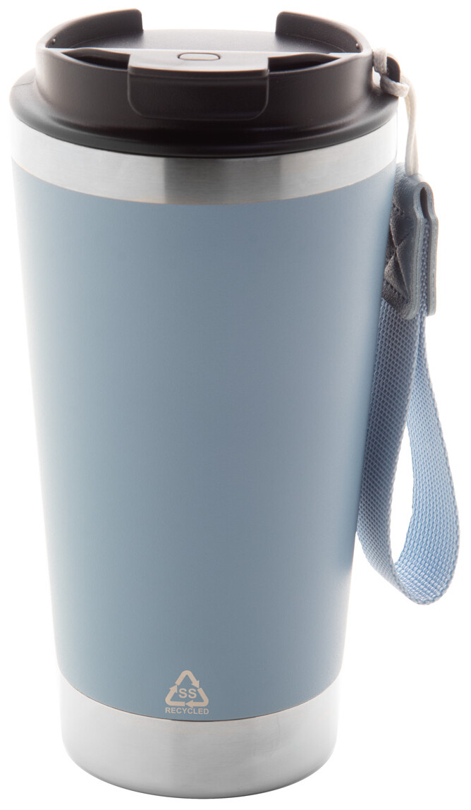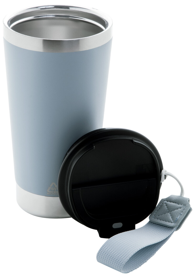 Dvoustěnný termo hrnek z recyklované nerezové oceli s víčkem na pití z PP a páskem na přenášení v odpovídající barvě. 430 ml.