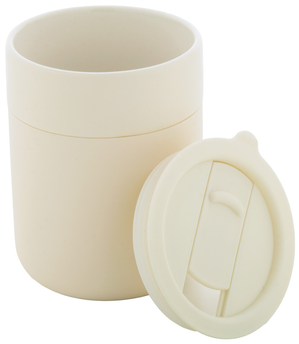 Silikonem potažený keramický cestovní kelímek s PP plastovým odkapávacím víčkem. 300 ml.