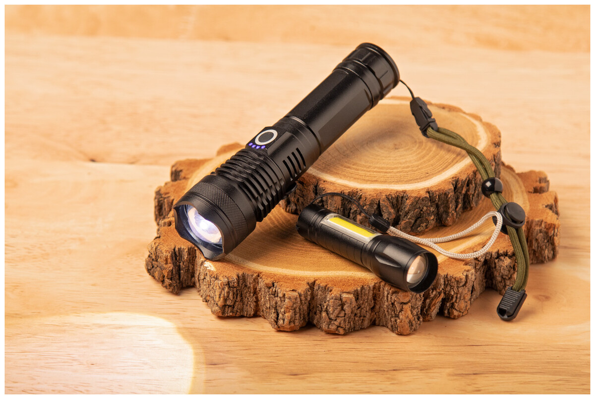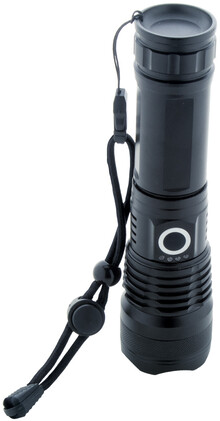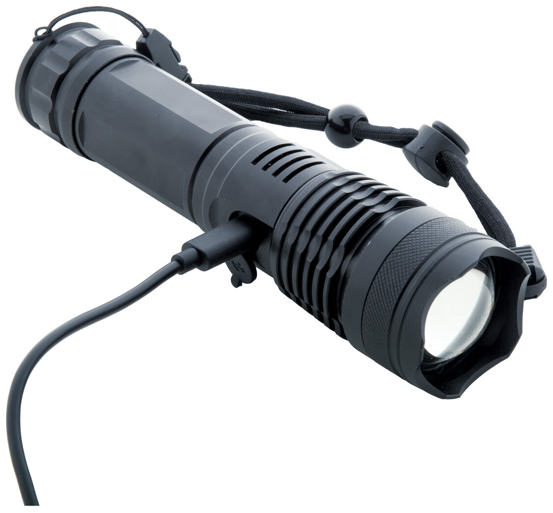Hliníková baterka s vestavěnou USB dobíjecí baterií (1500 mAh) a popruhem na přenášení. Se zoomovatelným vysoce výkonným COB světlem. S vysokým, středním, nízkým a blikajícím světlem. Včetně USB nabíjecího kabelu.