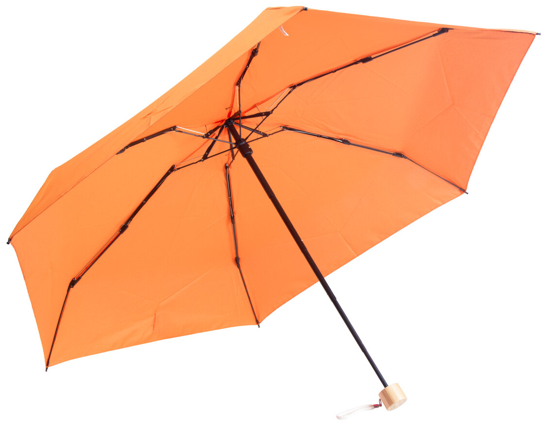Manuální, větruodolný 3-skládací mini deštník s 6 panely v pouzdru v odpovídající barvě. S kovovým rámem, sklolaminátovými žebry, bambusovou rukojetí a bavlněným poutkem na ruku. 190T RPET pongee, s výrazným štítkem RPET.