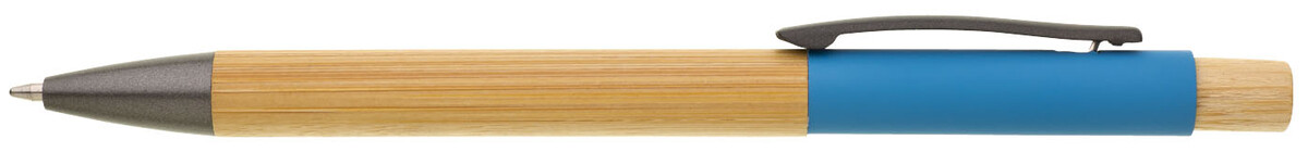 Bambusová propiska s tyrkysovou hliníkovou částí pod klipem, ideálním pro značení laserem. Náplň X20 modře píšící. Kolekce SAVE THE NATURE.