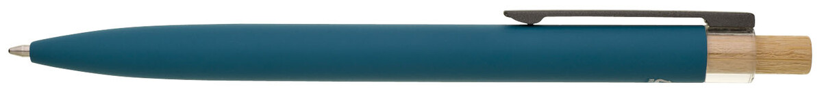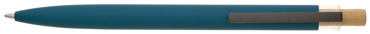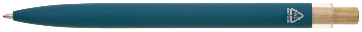 Modrá designová kovová propiska z recyklovaného hliníku. Tmavý kovový klip je uchycen v ozdobné transparentní koncovce, doplněné bambusovým cvakátkem. Náplň velkoobsahová, modře píšící. Kolekce SAVE THE NATURE.