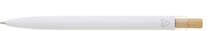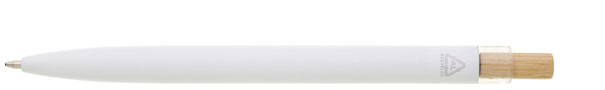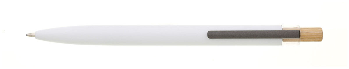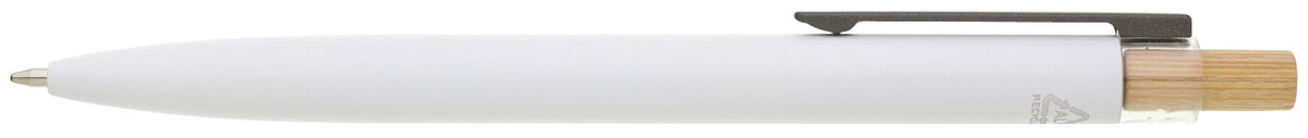 Bílá designová kovová propiska z recyklovaného hliníku. Tmavý kovový klip je uchycen v ozdobné transparentní koncovce, doplněné bambusovým cvakátkem. Náplň velkoobsahová, modře píšící. Kolekce SAVE THE NATURE.