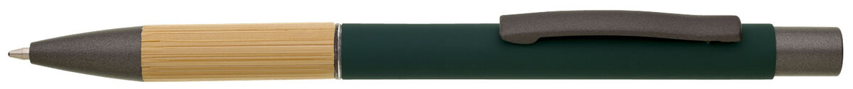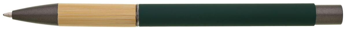 Kovová propiska s hnědo-černými doplňky, zeleným pogumovaným povrchem a bambusovým úchopem. Náplň VO modře píšící. Kolekce SAVE THE NATURE.