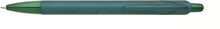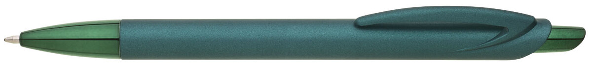 Zelené plastové metalické tělo doplňují lesklé barevné doplňky. Velkoobsahová gelová náplň, modře píšící.