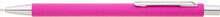 Tenká, jednoduchá propiska s růžovým pogumovaným tělem a chromovými doplňky. Náplň X20, modře píšící.