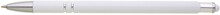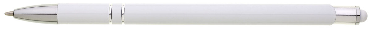 Tenká bílá hliníková propiska s chromovými doplňky a touchem v barvě těla. Náplň X20 modře píšící.