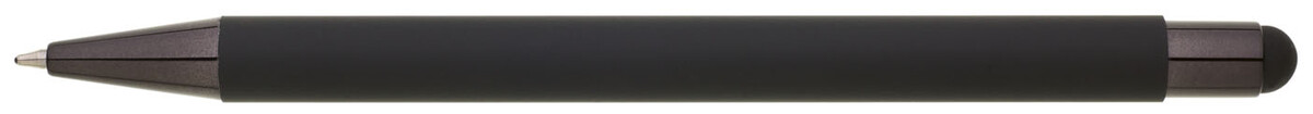 Černé pogumované matné tělo propisky doplňují lesklé doplňky v barvě těla a matný touch konec. Logo po vylaserování je lesklé stříbrné. Velkoobsahová modře píšící náplň.