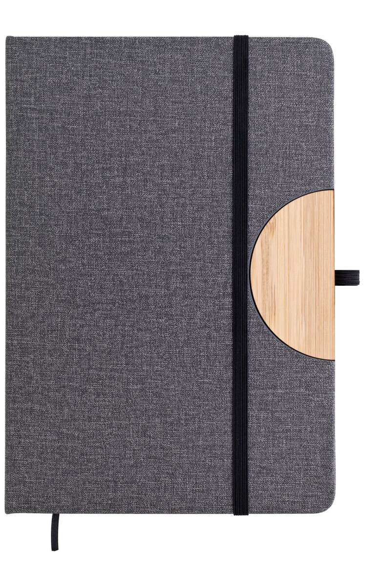 Poznámkový blok, zápisník v textilních deskách, které lze použít jako stojánek na mobil.