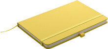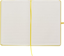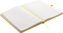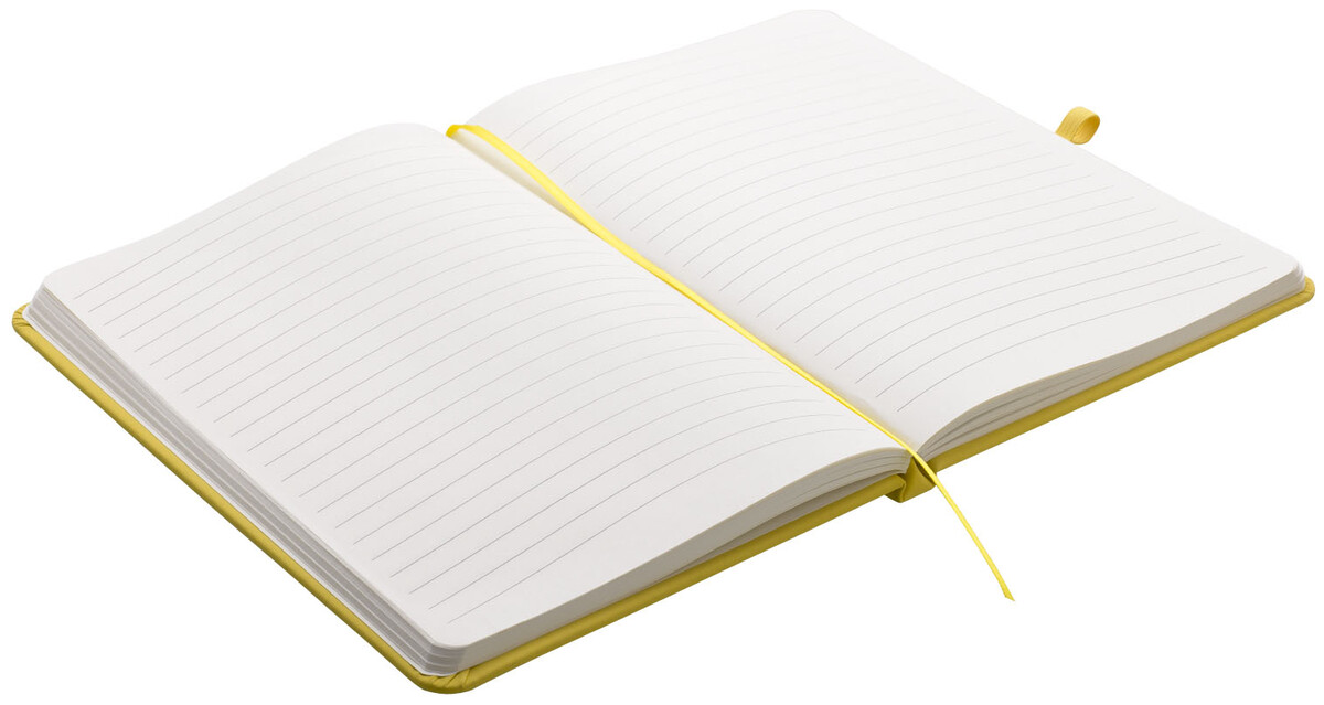 Zápisník A5 ve žlutých deskách z PU materiálu má 80 linkovaných listů. Blok má uzavírací gumičku, poutko na propisku a textilní záložku v barvě desek.